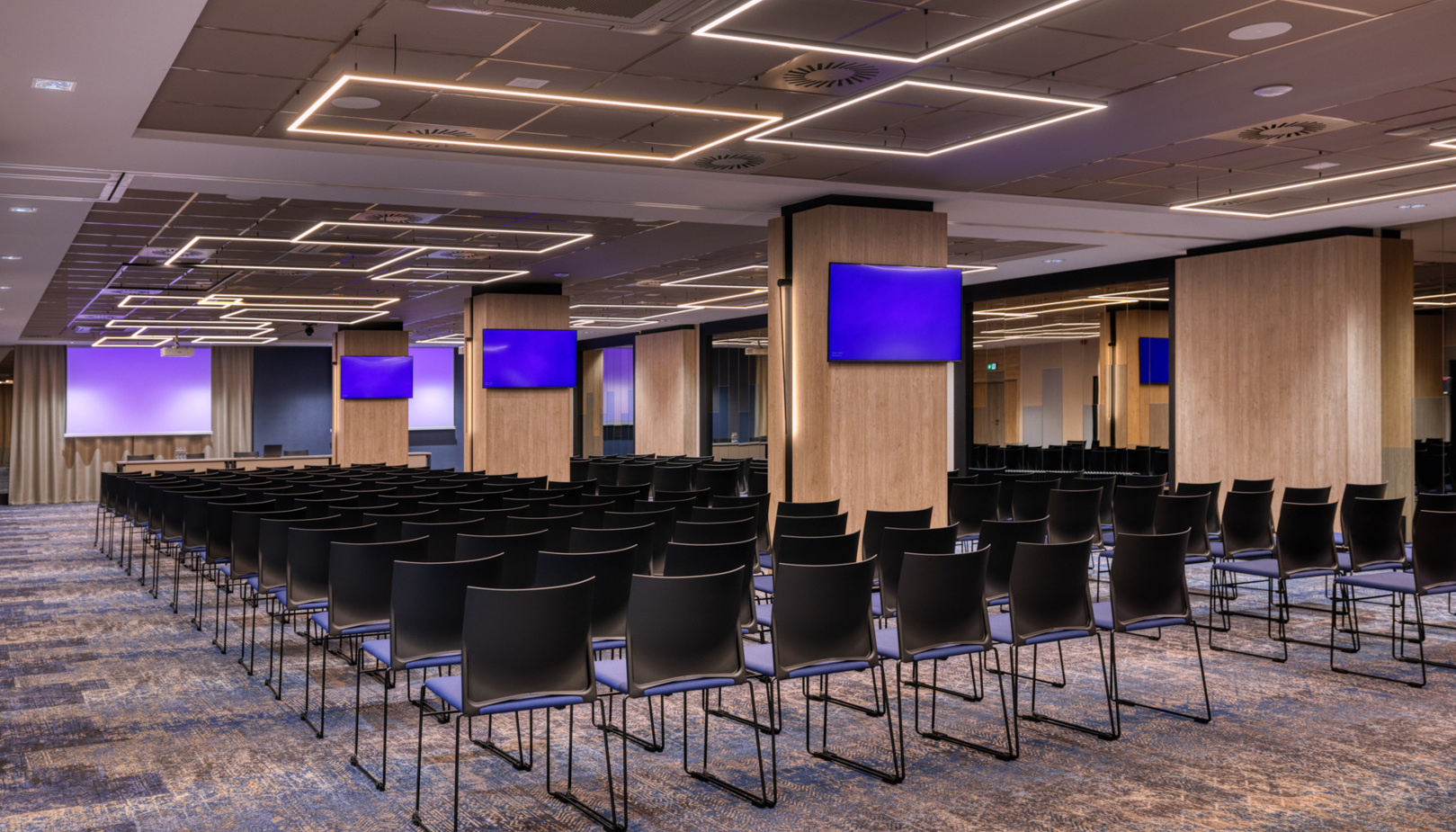 Sala konferencyjna PORTO to przestronne i nowoczesne miejsce idealne na organizację wydarzeń biznesowych, szkoleń oraz konferencji dla 200 osób. Wyposażona w nowoczesny sprzęt multimedialny, doskonałe nagłośnienie oraz klimatyzację, zapewnia komfort uczestnikom. Dzięki modułowemu układowi sali możliwa jest elastyczna aranżacja przestrzeni, dostosowana do potrzeb klienta. Dodatkowo, jasne wnętrza i ergonomiczne meble sprzyjają skupieniu, a dostęp do szybkiego internetu ułatwia organizację wydarzeń online. Sala PORTO stanowi idealne rozwiązanie dla firm ceniących profesjonalizm i wygodę.